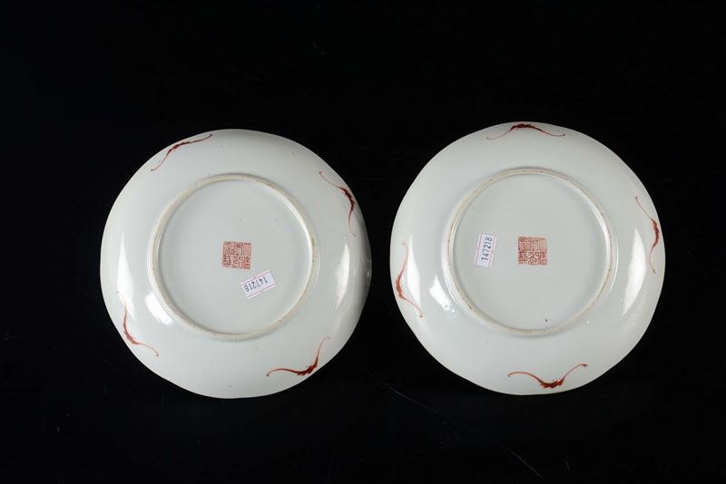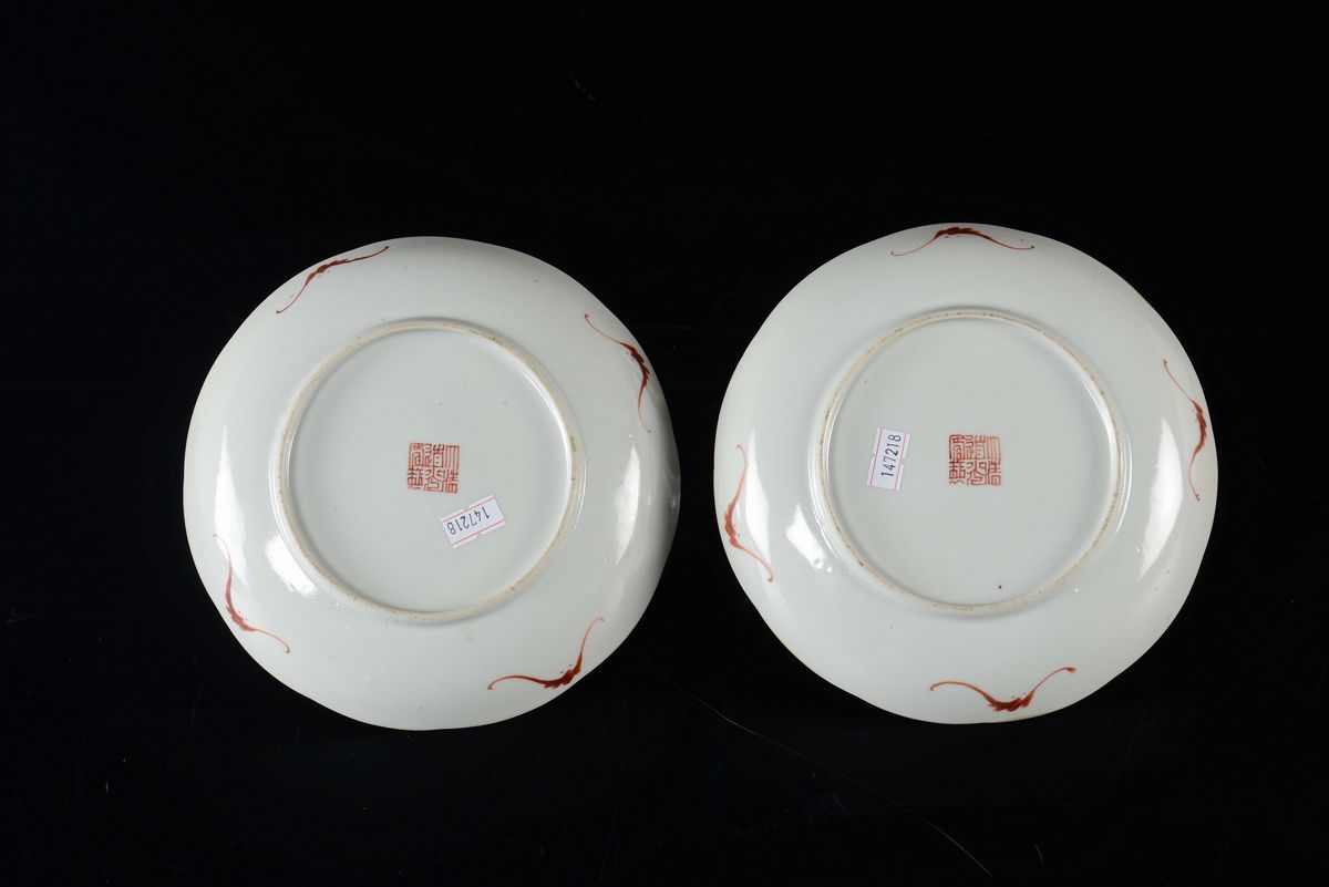 A pair of polychrome enamelled porcelain dishes with floral decoration, China, Qing Dynasty, 19th century