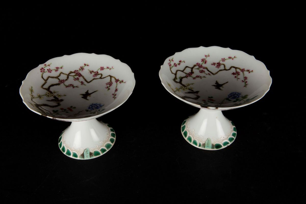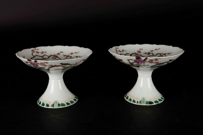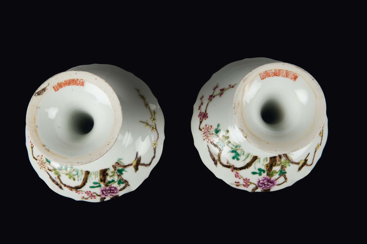 A pair of polychrome enamelled porcelain lifts with birds and flowers, China, 20th century
