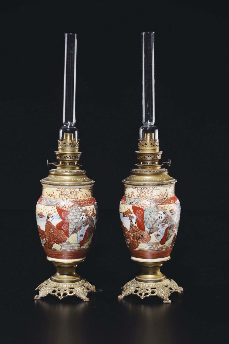 A pair of Satsuma vases on a bronze lamp base, Japan, 19th century