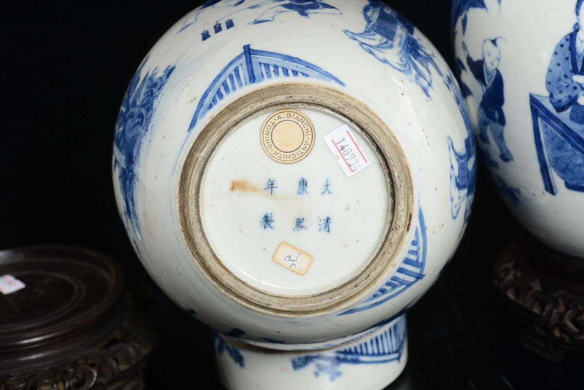 A pair of small blue and white potiches and cover depicting playing figures, China, Qing Dynasty, 18th century