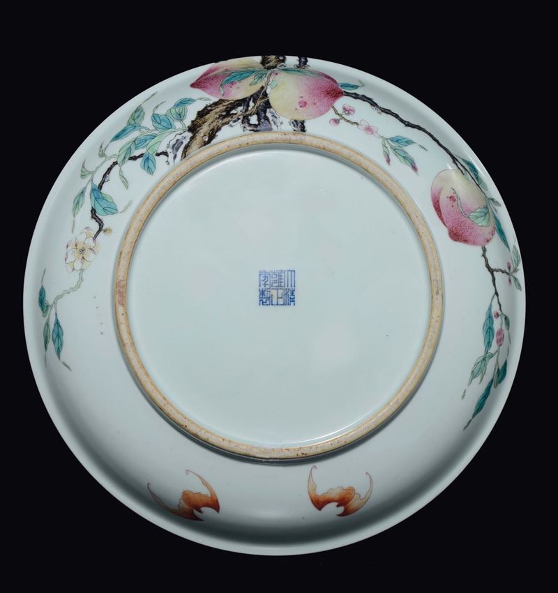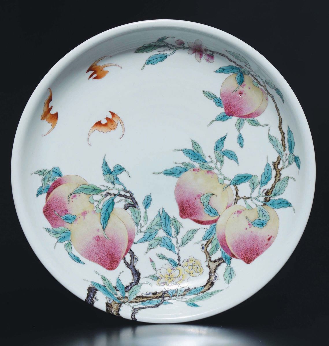 A polychrome enamelled porcelain dish with bats and peaches, China, Qing Dynasty, 19th century
