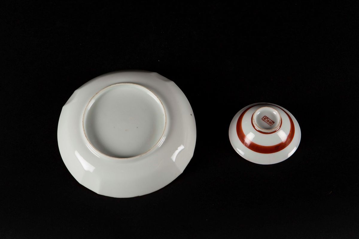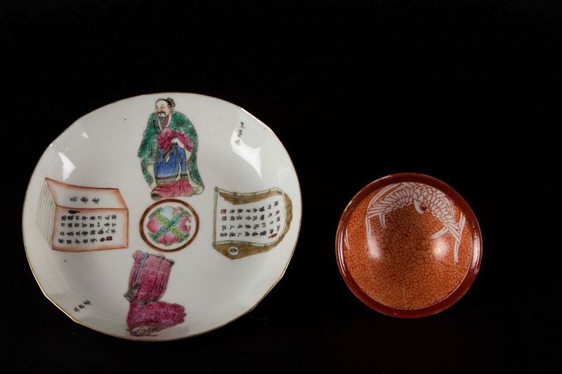 A polychrome enamelled porcelain dish with dignitaries and inscription and a red-ground cup, China, 20th century