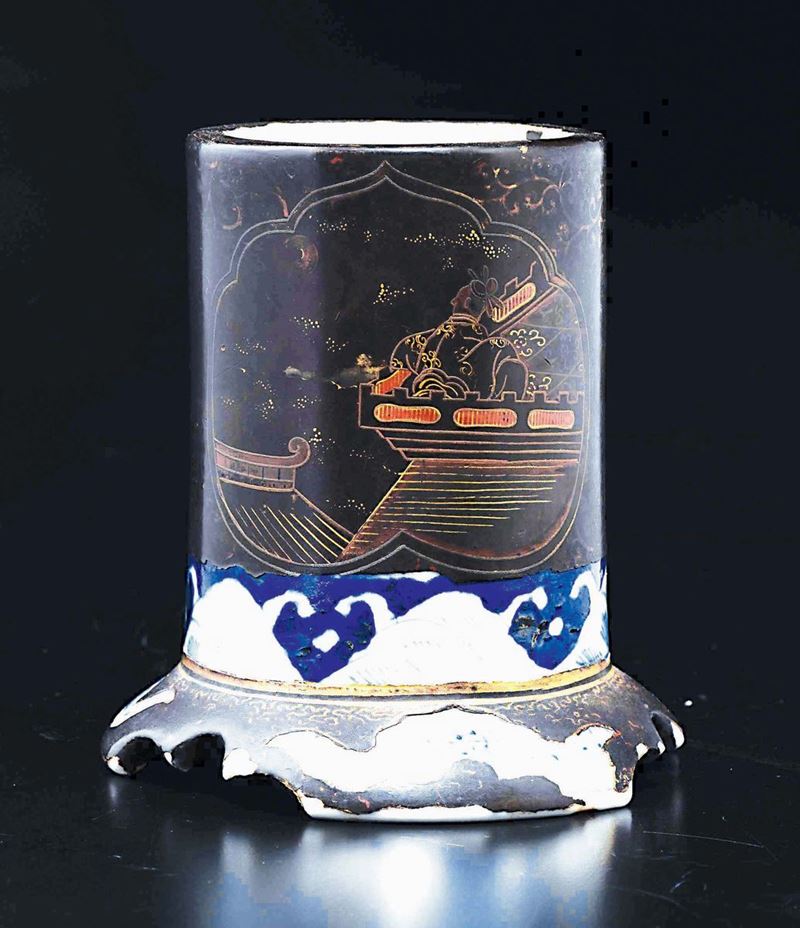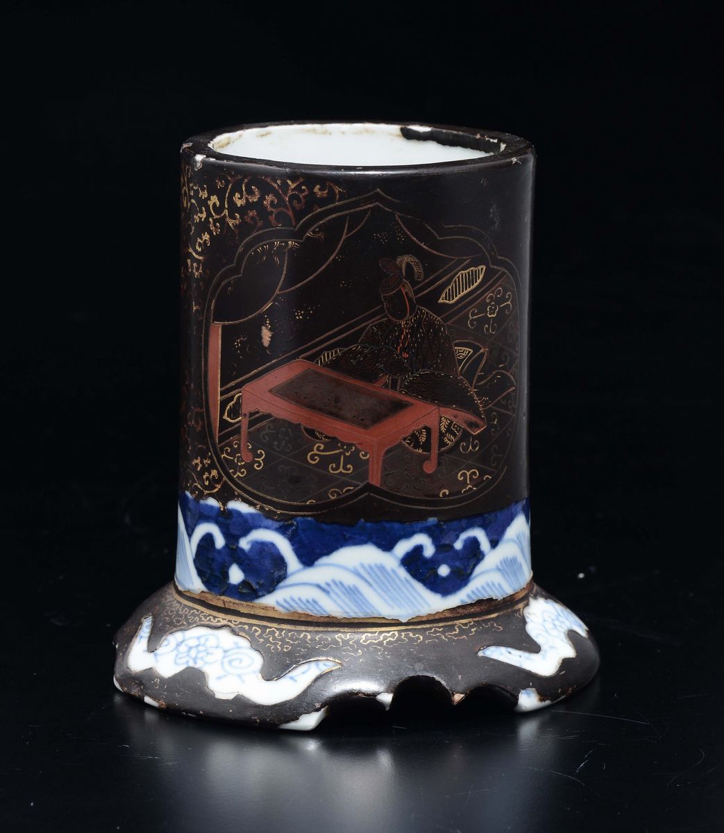 A porcelain and lacquer brushpot depicting dignitaries, Japan, 19th century