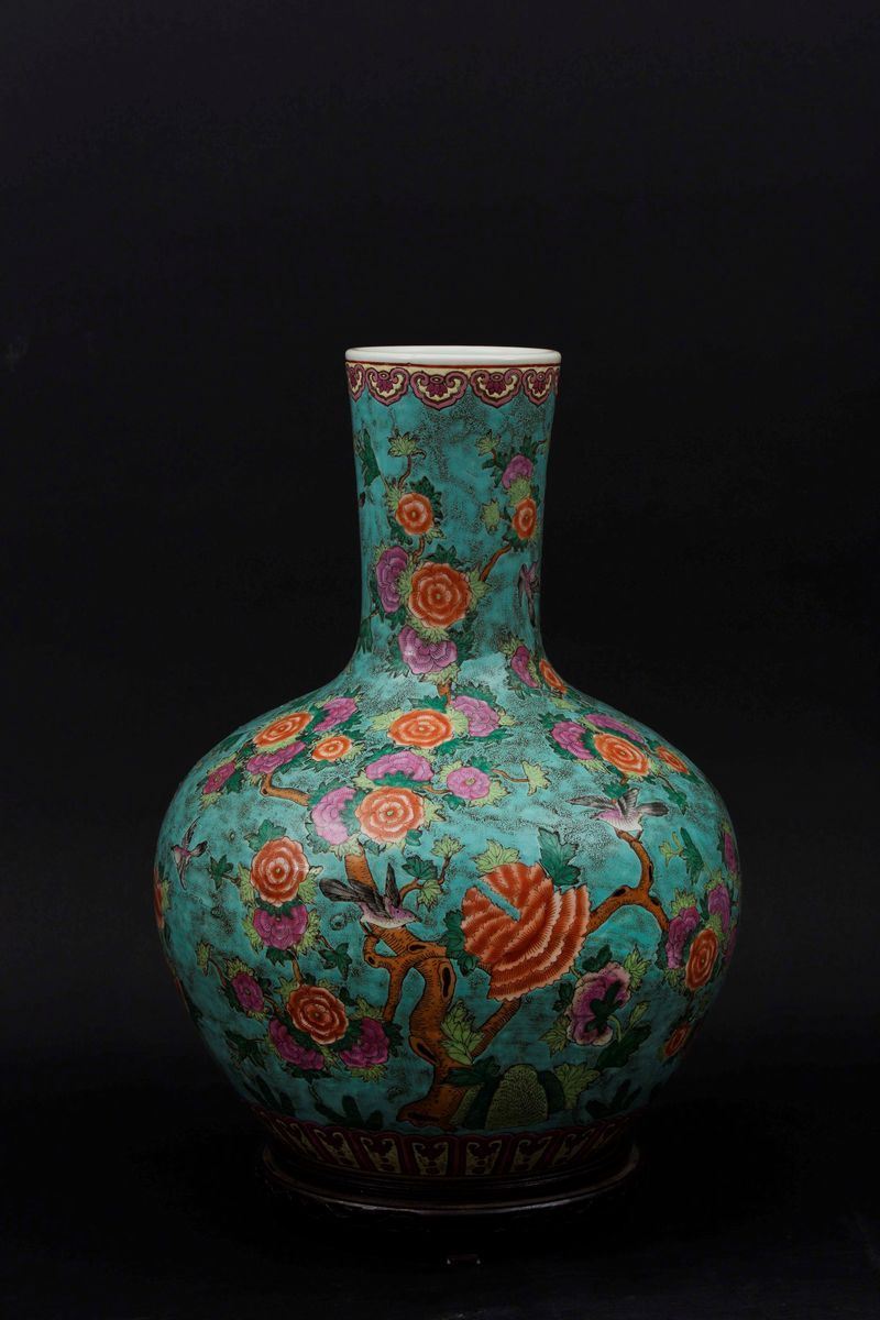 A turquoise-ground porcelain vase with flowers and birds, China, 20th century