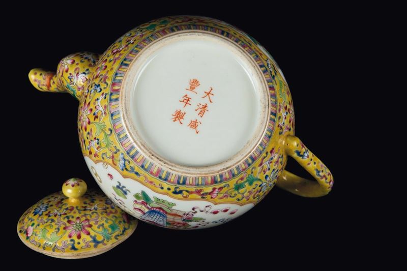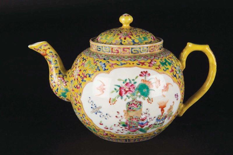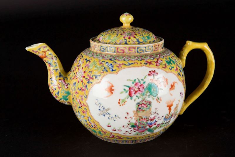 A yellow-ground porcelain teapot with naturalistic decoration within reserves, China, 20th century