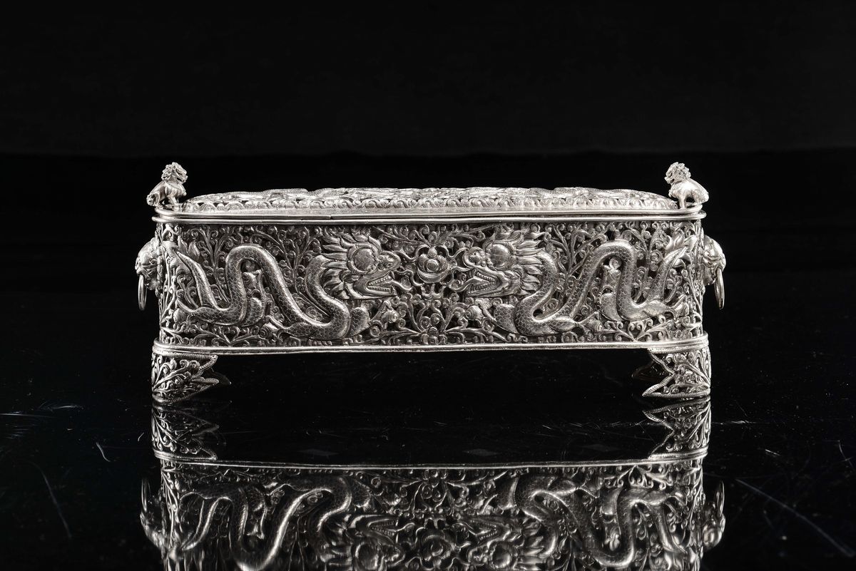 An embossed silver and fretworked box with floral motifs and dragons, China, Qing Dynasty, 18th-19th century