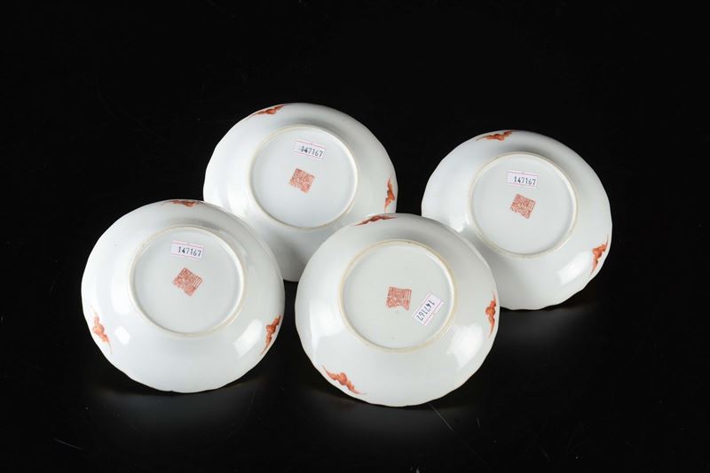 Four polychrome enamelled porcelain dishes with dignitaries and inscriptions, China, Qing Dynasty, 19th century