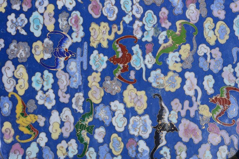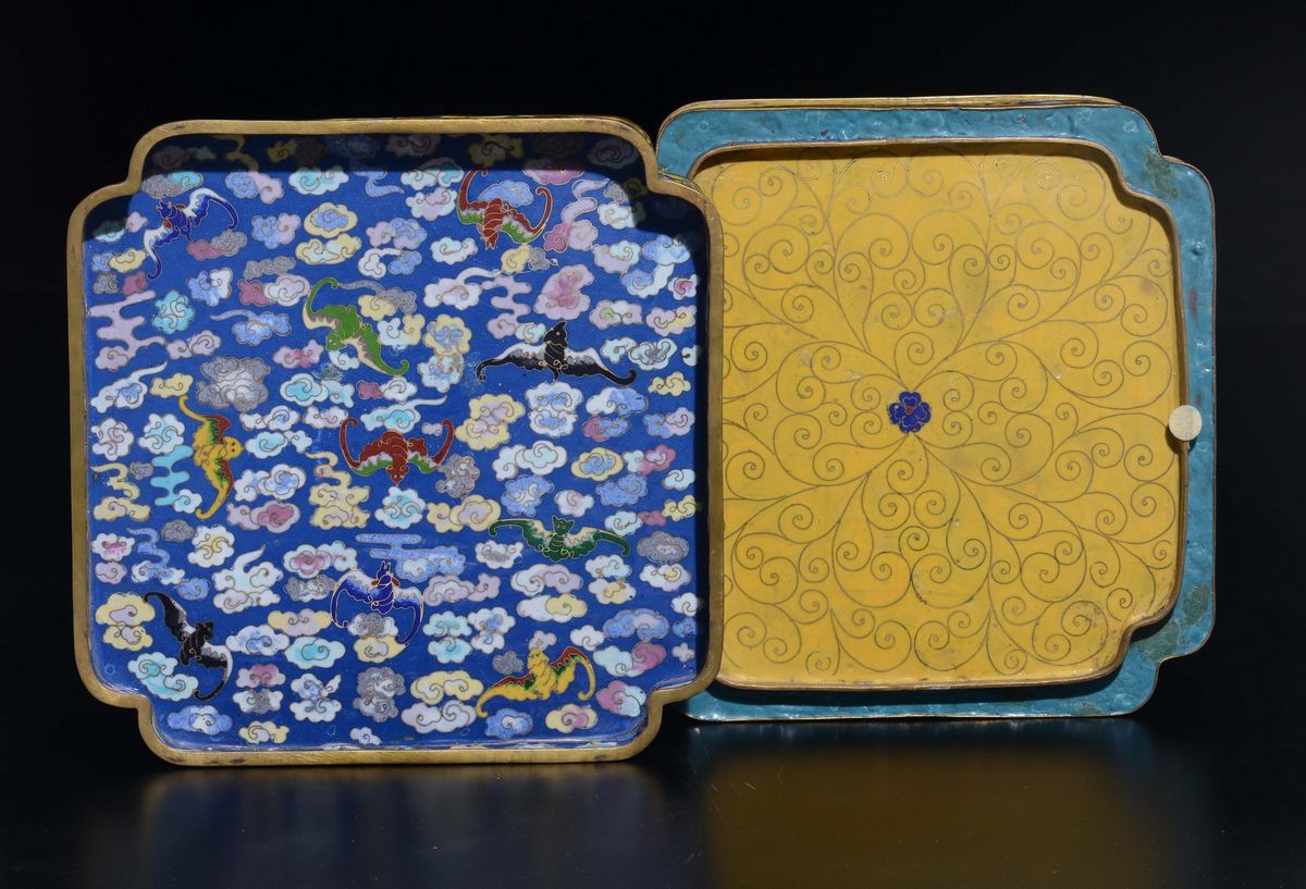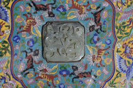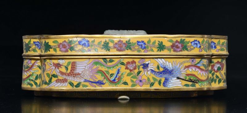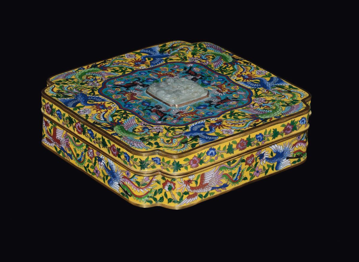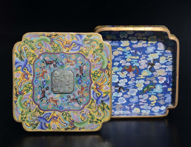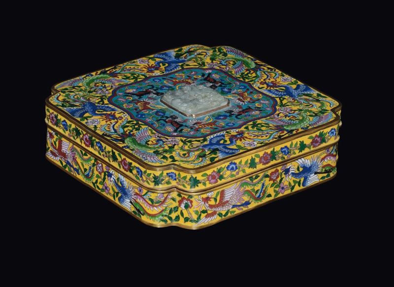 A cloisonné enamel square box and cover depicting horses, phoenicians and flowers, with a white jade plaque on the top, [..]