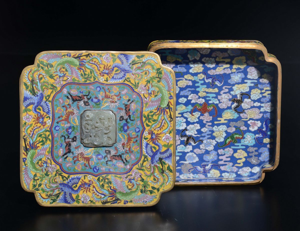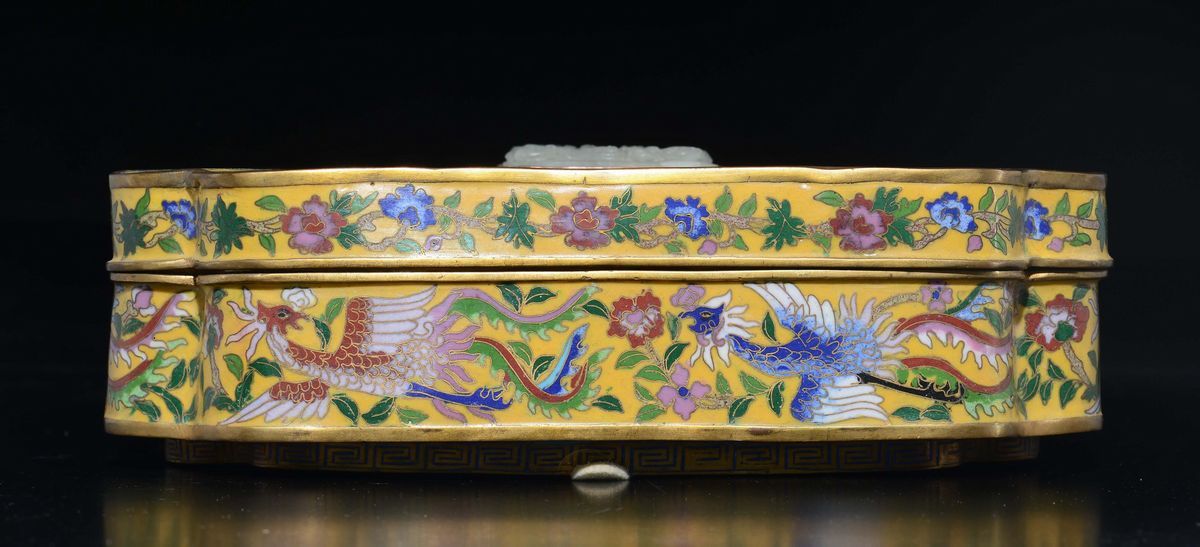 A cloisonné enamel square box and cover depicting horses, phoenicians and flowers, with a white jade plaque on the top, China, Qing Dynasty, 19th century