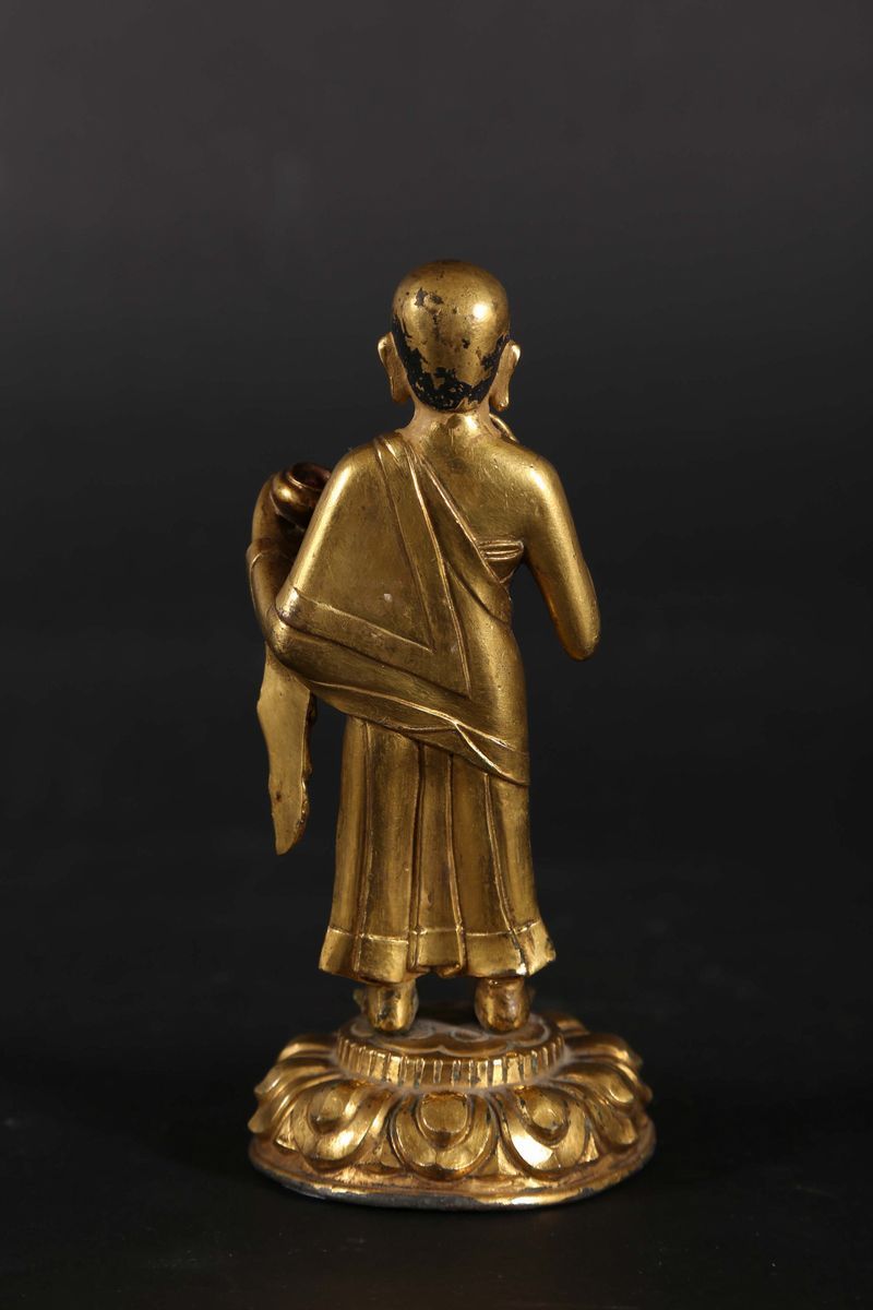 A gilt bronze figure of standing monk with a cup, Tibet, 18th century