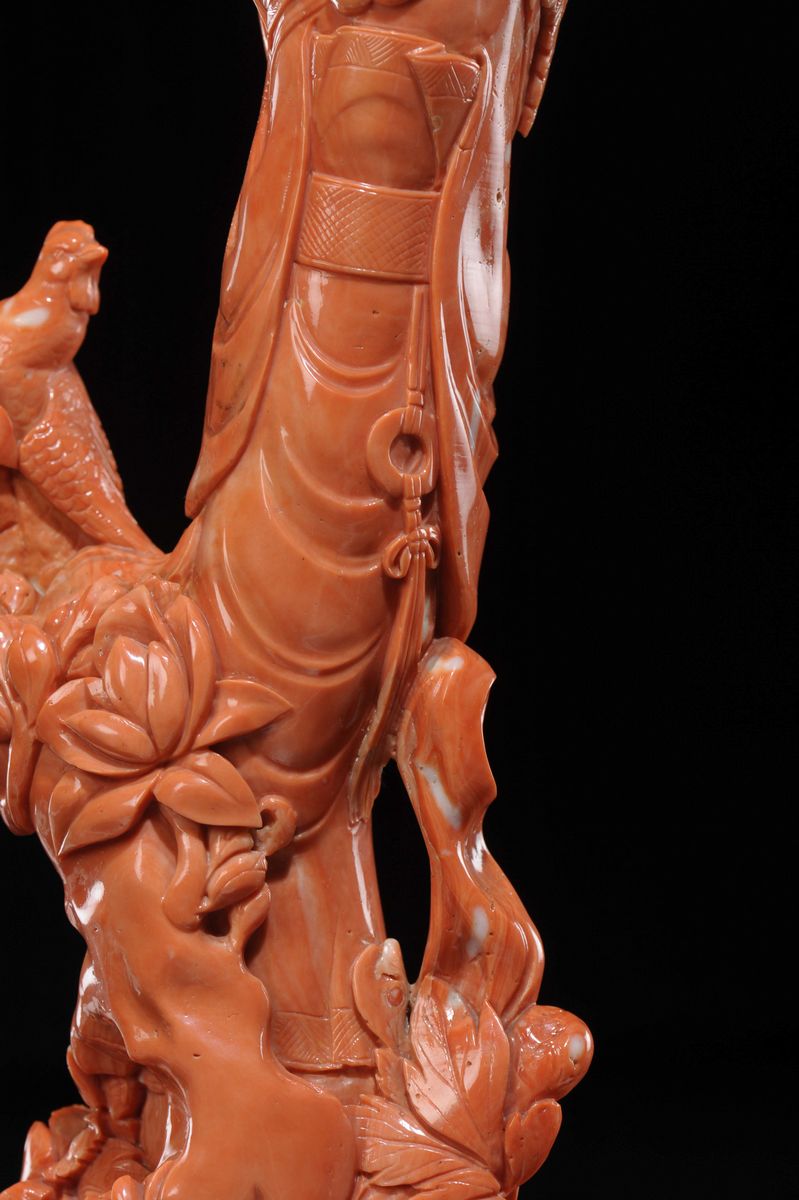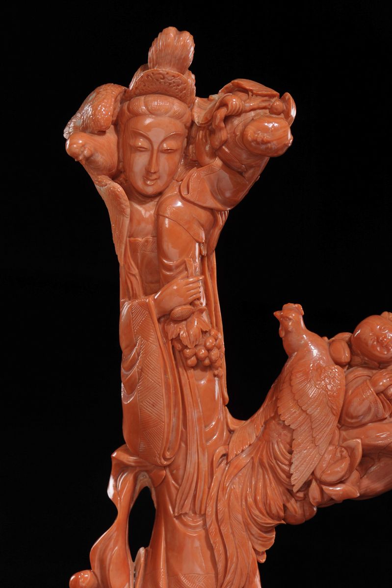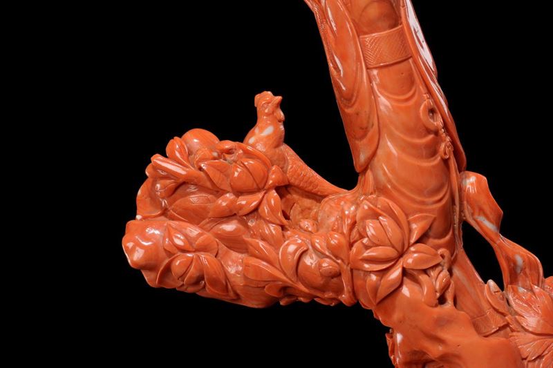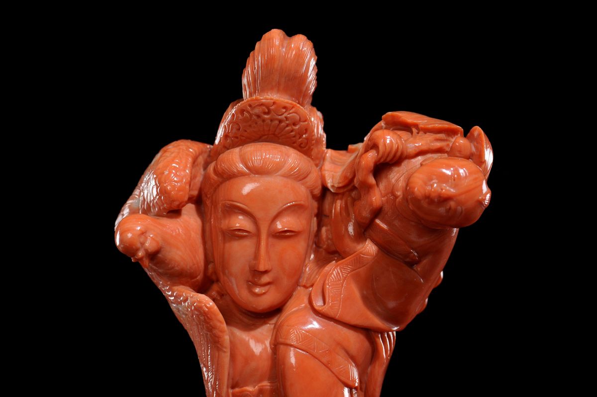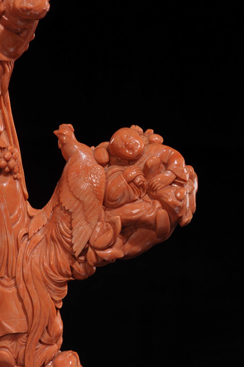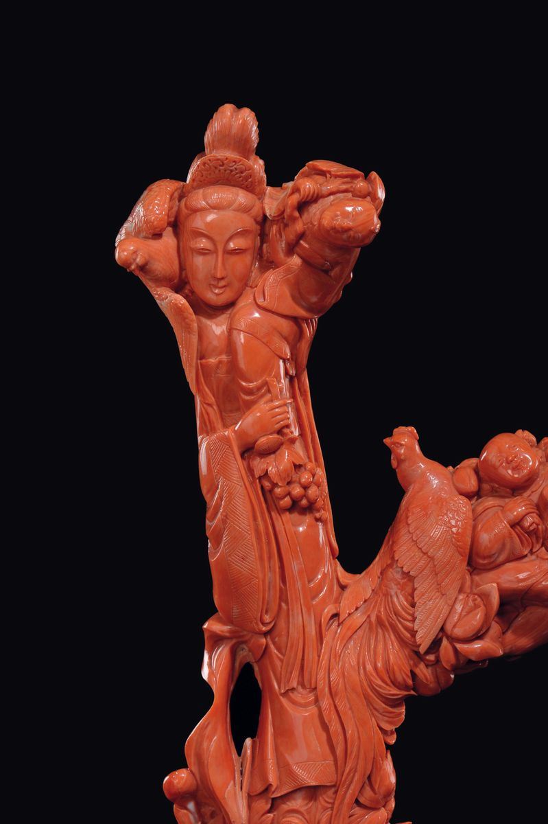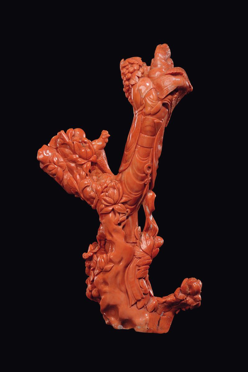 A large carved coral group Guanyin on flowers with a grapes in her hand surrounded by birds and children, China, early 20th [..]