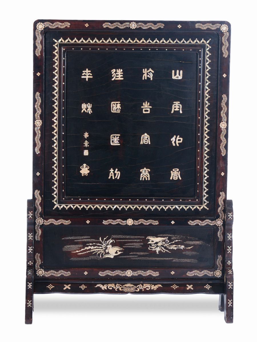 A large shell-inlaid lacquer screen depicting scholars and inscriptions, Ryuku Style, China, Qing Dynasty, 18th/19th cent [..]
