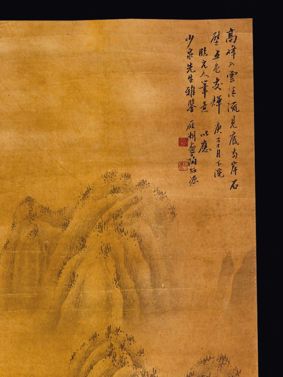 A painting on paper depicting mountain landscape crossed by a river with a small boat and inscription, China, Ming Dynasty, [..]