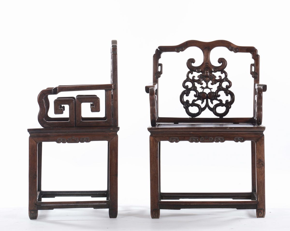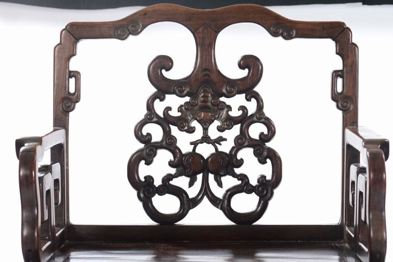A pair of homu bat and peaches openwork back armchairs, China, Qing Dynasty, Daoguang Period (1821-1850)