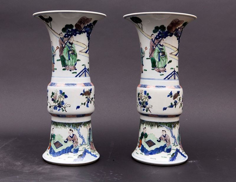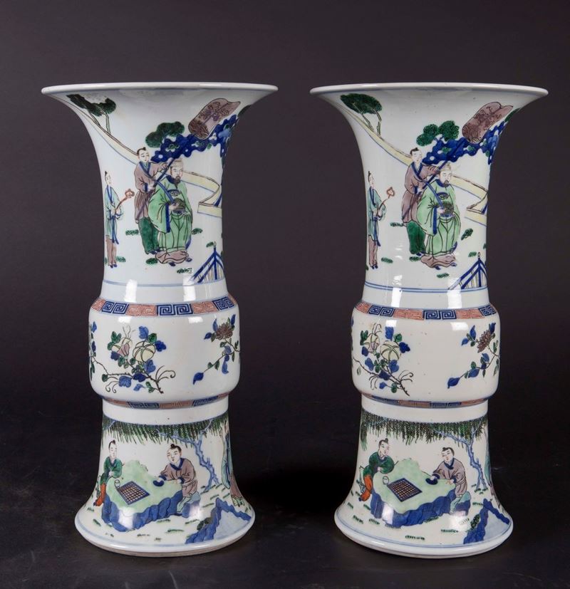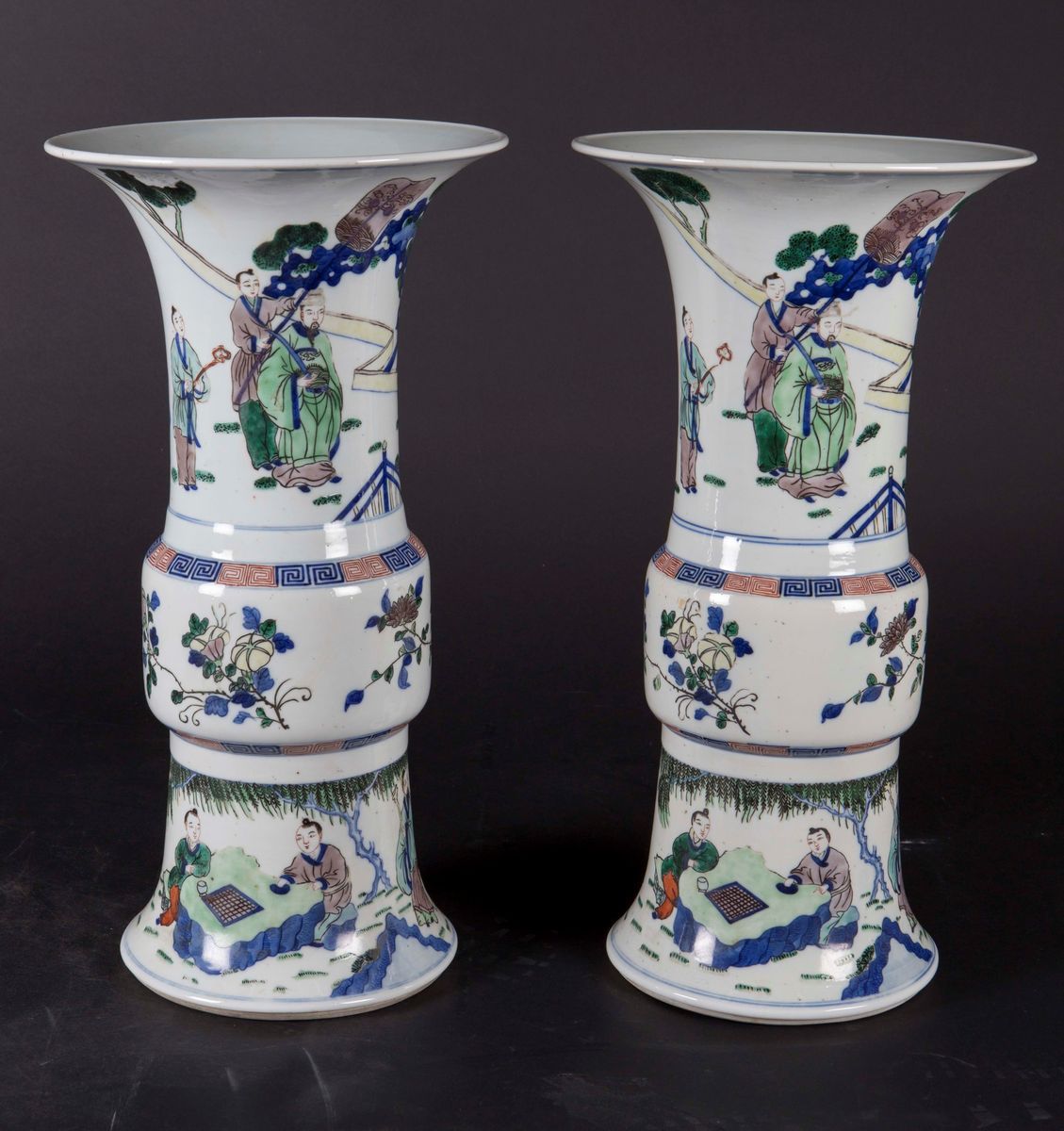 A pair of polychrome enamelled porcelain Beaker vases, Gu, China, Qing Dynasty, Shunzhi Period (1664-1661)