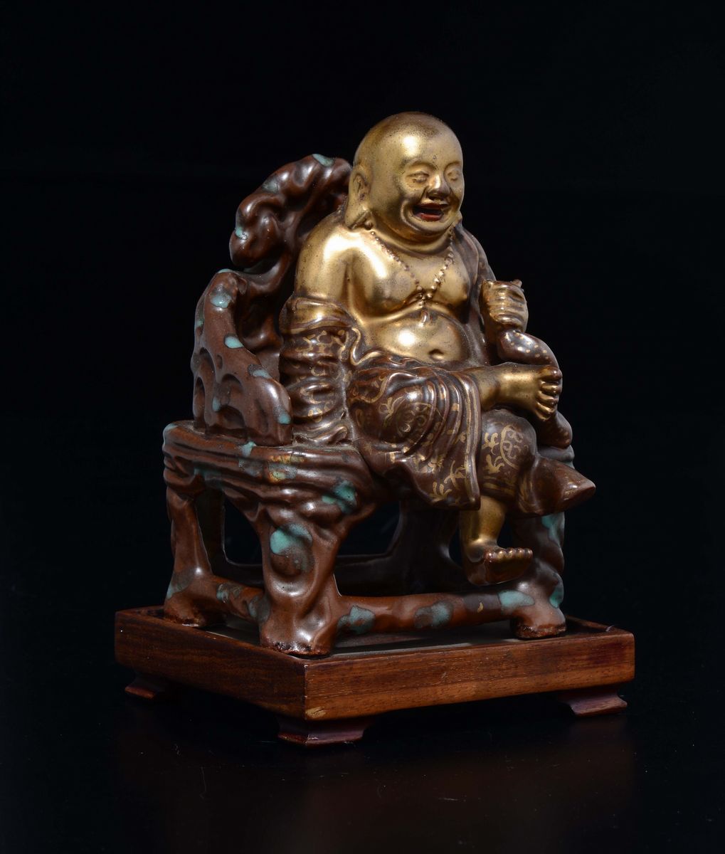 A polychrome enamelled porcelain figure of Budai seated on throne, China, Qing Dynasty, 19th century
