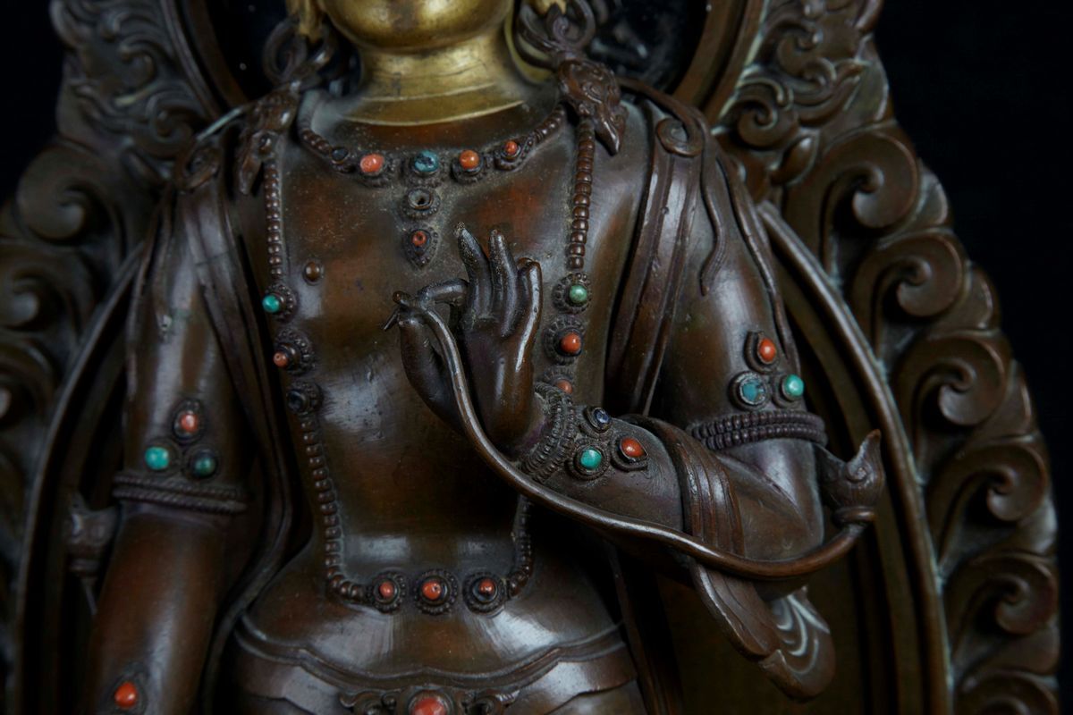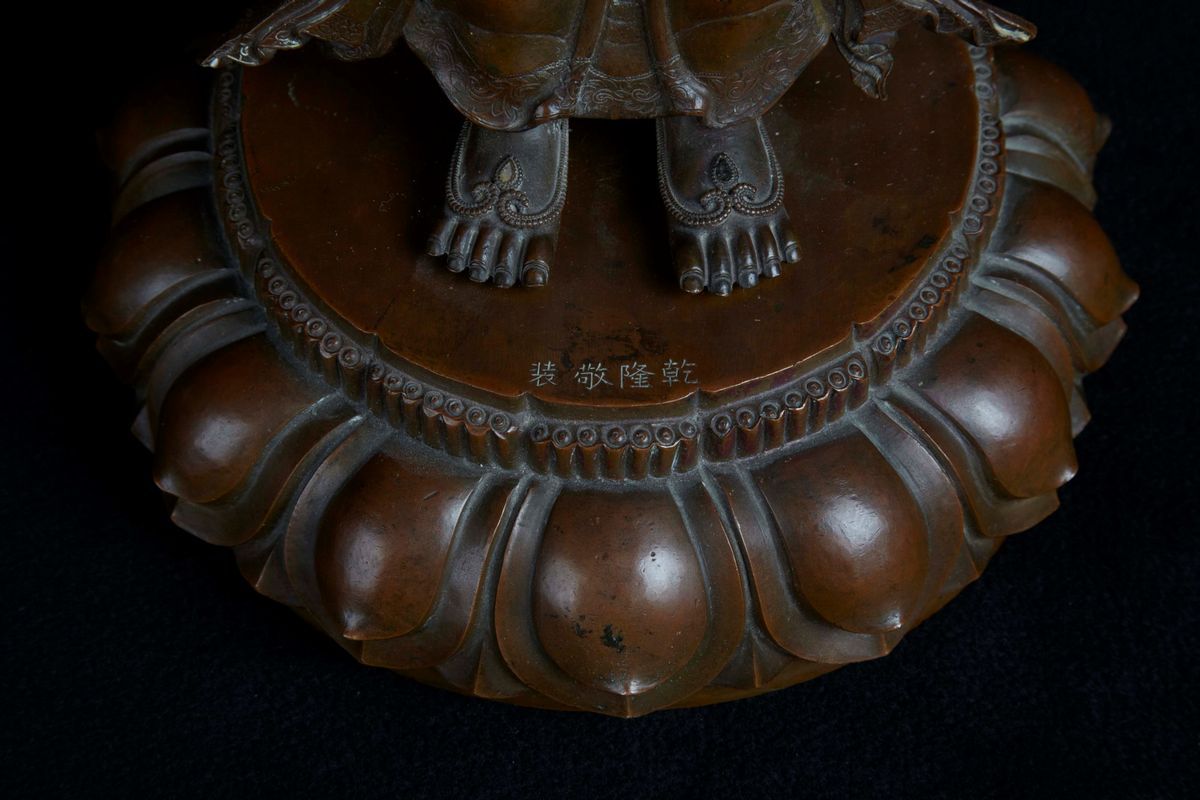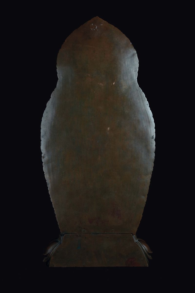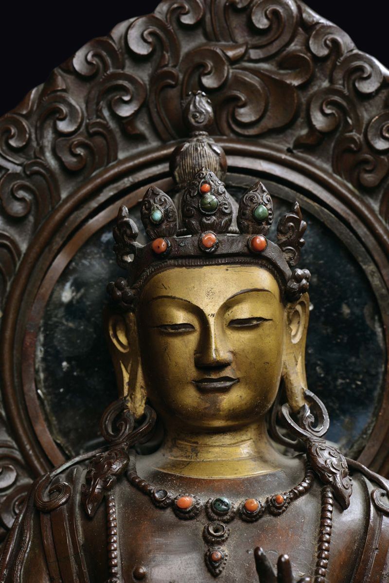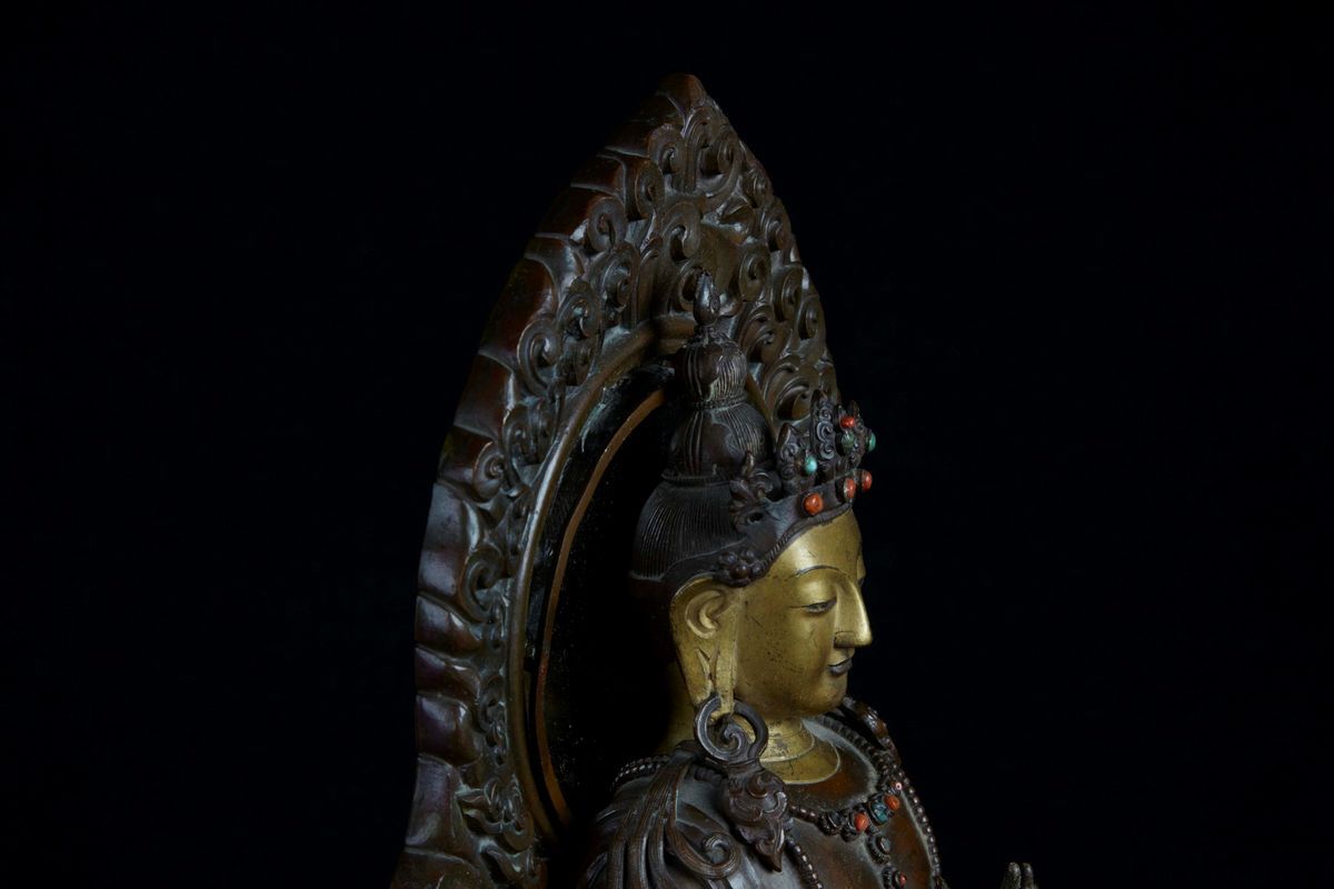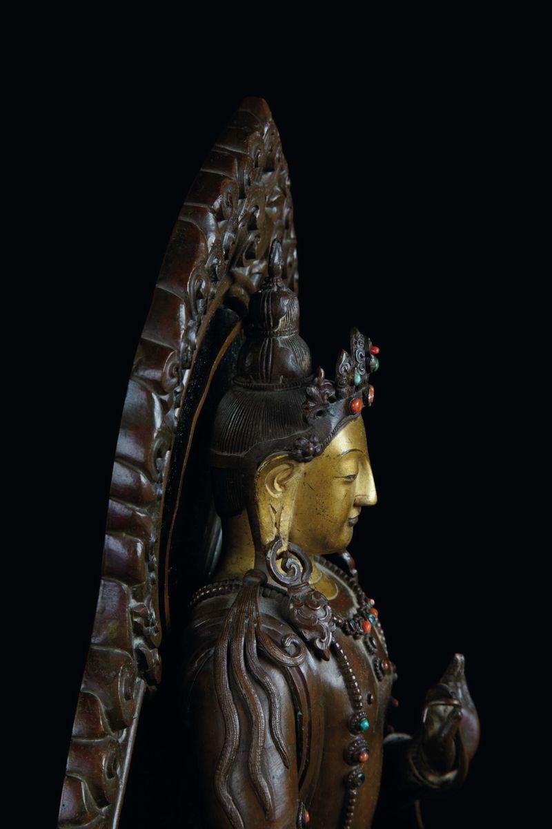 A rare and large semi-gilt copper figure of Bodhisattva with aura, China, Qing Dynasty, Qianlong Mark and of the Period [..]