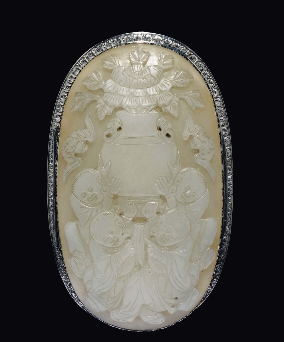 A silver box with a white jade children plaque on the cover, China, Qing Dynasty, Qianlong Period (1736-1795)