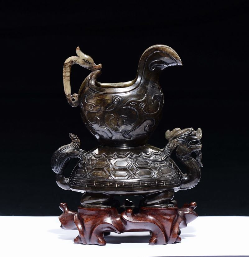 A small green and russet jade tortoise and vase group, China, 20th century