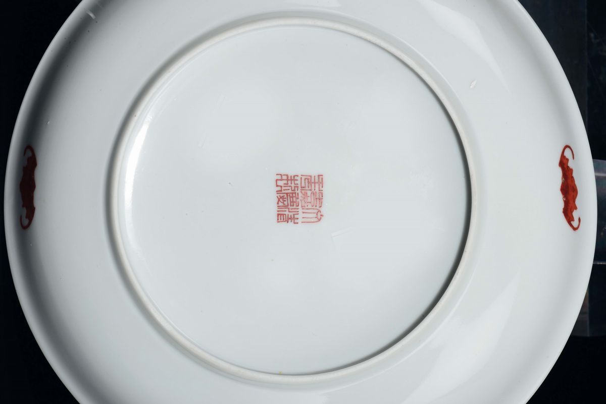 Four polychrome enamelled porcelain dishes with dragon and red bats, China, early 20th century