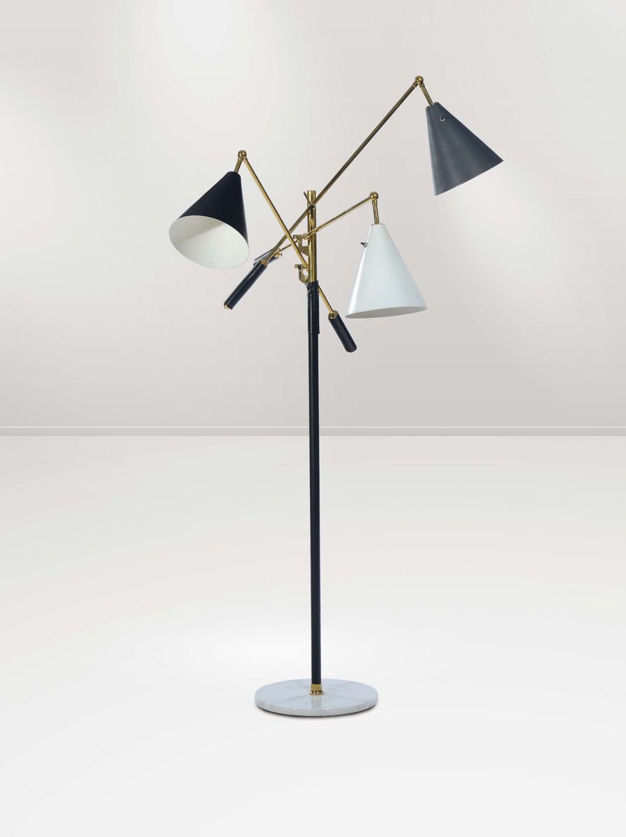 Lampada con base in marmo e struttura in metallo. Contrappesi rivestiti in pelle.Prod. Casey Fantin, distr. Koch & Lowy,1955 ca. BibliografiaPubblicità d’epoca apparsa su Interiors; Archivio Casey Fantin.
