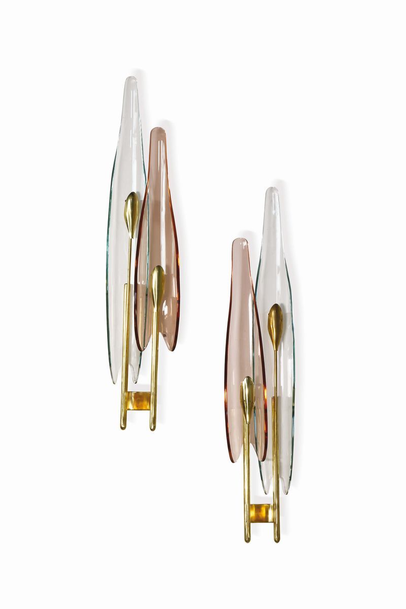 Coppia di appliques modello 1461 Dahalia con diffusori in cristallo curvato e montatura in ottone.Prod. Fontana Arte, Italia, 1955cm 16x75x12