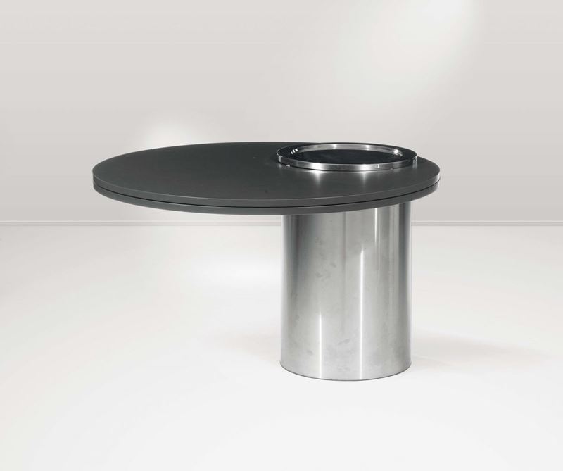 Raro tavolo Otto con base in acciaio spazzolato e piani in legno laccato.Prod. Tarzia, Italia, 1974cm 187x75