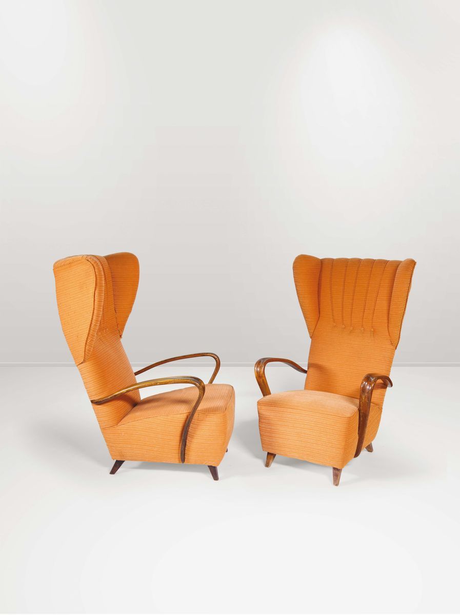 Coppia di poltrone in legno con rivestimenti in tessuto.Prod. Italia, 1950 ca.cm 73x118x85