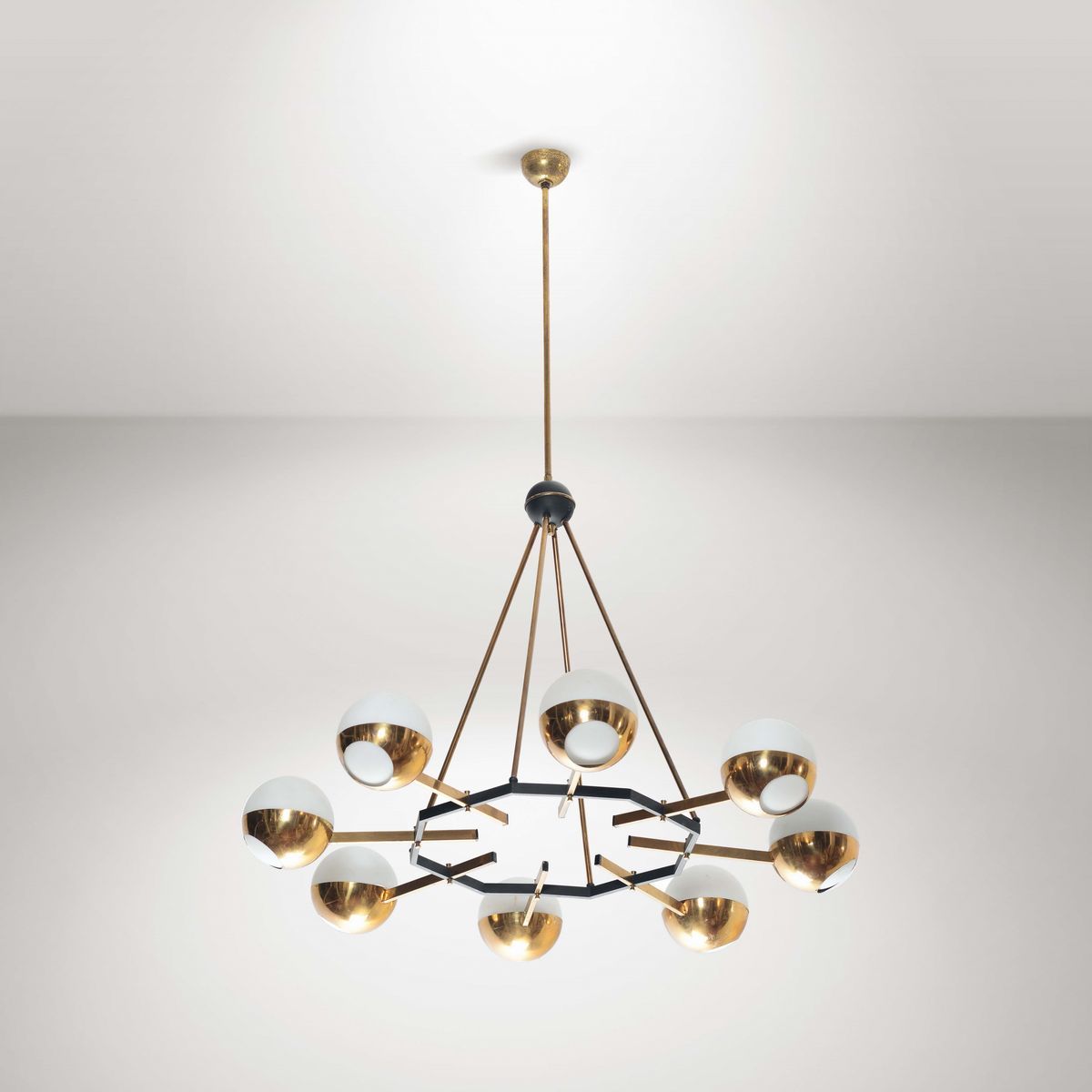 Lampadario con struttura in ottone e metallo verniciato. Diffusori in vetro opalino.Prod. Stilnovo, Italia, 1950 ca.cm. 80x110