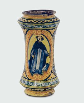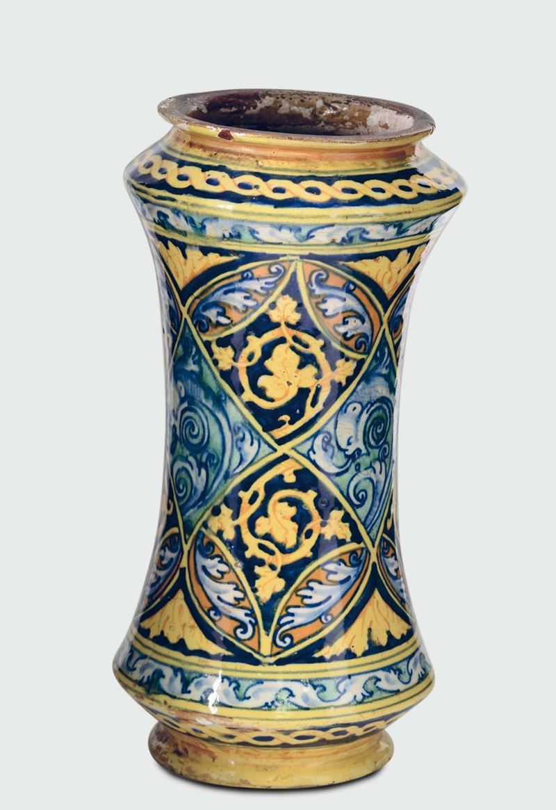 Maiolica a gran fuoco in policromia, altezza cm 29,2 Lievi restauri alla boccaNel grande medaglione ovale con “baccellature puntate” la figura di un Santo Martire, entro un paesaggio montano.Decorazione a cinque fasce orizzontali con decori geometrici e floreali. La fascia centrale è decorata, al verso, tralci di foglie di quercia, foglie di acanto e delfini, su fondo blu cobalto.Corpo cilindrico, ventre fortemente rastremato, piede su base circolare, lievemente incavato. Bocca circolare estroflessa. Collezione palermitana.