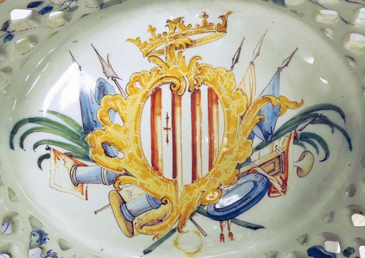 Maiolica a gran fuoco dipinta in policromia, dimensione cm 24,5Cadute di smalto visibiliCorpo ovale a pareti traforate, base piana lievemente incavata. Bordo orlato “a lunette”, prese a maniglione.Decorazione a mazzetti di vari fiori recisi. Bordo superiore dipinto con una catenella smerlatura rovesciata. Nel centro lo stemma veneziano della famiglia Grimani.