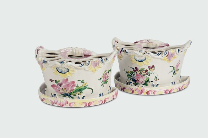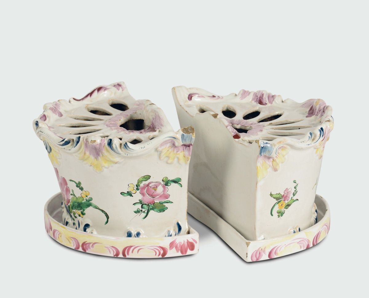 Maiolica a terzo fuoco in policromia, dimensioni cm 12x22 e cm 2,2x21,0x12,3Buono stato di conservazione, piccole sbeccatureCorpo semicilindrico lievemente rastremato su piede rilevato a fondo piano. I bordi a rilievo con conchiglie, barbette e rocaille. Il corpo superiore con fori “a mandorla”. Rara e forse unica la presenza dei due presentatoi dal bordo rialzato. Marca del chiodino, in manganese, nei portafiori ed in un presentatoio.Decorazione a mazzetto di fiori vari con tralci fioriti e fogliati del tipo “contornato”. Alcuni fiori sparsi La pittura investe vari elementi a rilievo rendendo il portafiori particolarmente luminoso.