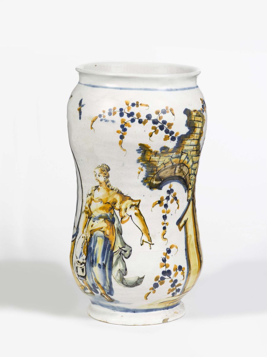 Maiolica a gran fuoco in policromia, altezza cm 27,5 Buono stato di conservazioneCorpo “a balaustro” su piede lievemente svasato e incavato, bocca circolare estroflessa.Sulla faccia anteriore è raffigurato l’episodio di “Cristo e la Samaritana al pozzo”. Sulla faccia retrostante “rovine” e racemi fioriti.Le misure, la maniera pittorica e la segnatura legano quest’opera ad una serie di albarelli, oggi dispersa in varie raccolte pubbliche e private, la cui tematica figurativa è incentrata su episodi del Vecchi e del Nuovo Testamento. Si segnalano i sette del Museo di Faenza, alcuni dei quali molto vicini alla maniera di Agostino Ratti.Marca Lanterna, in blu, alla base