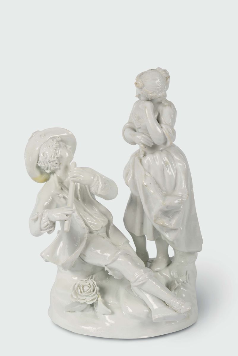 Porcellana, monocroma, altezza cm 15,0Ampi restauriRaffigurante un giovane che suona il flauto davanti ad una giovane in ascolto su base rocciosa e fiorita.