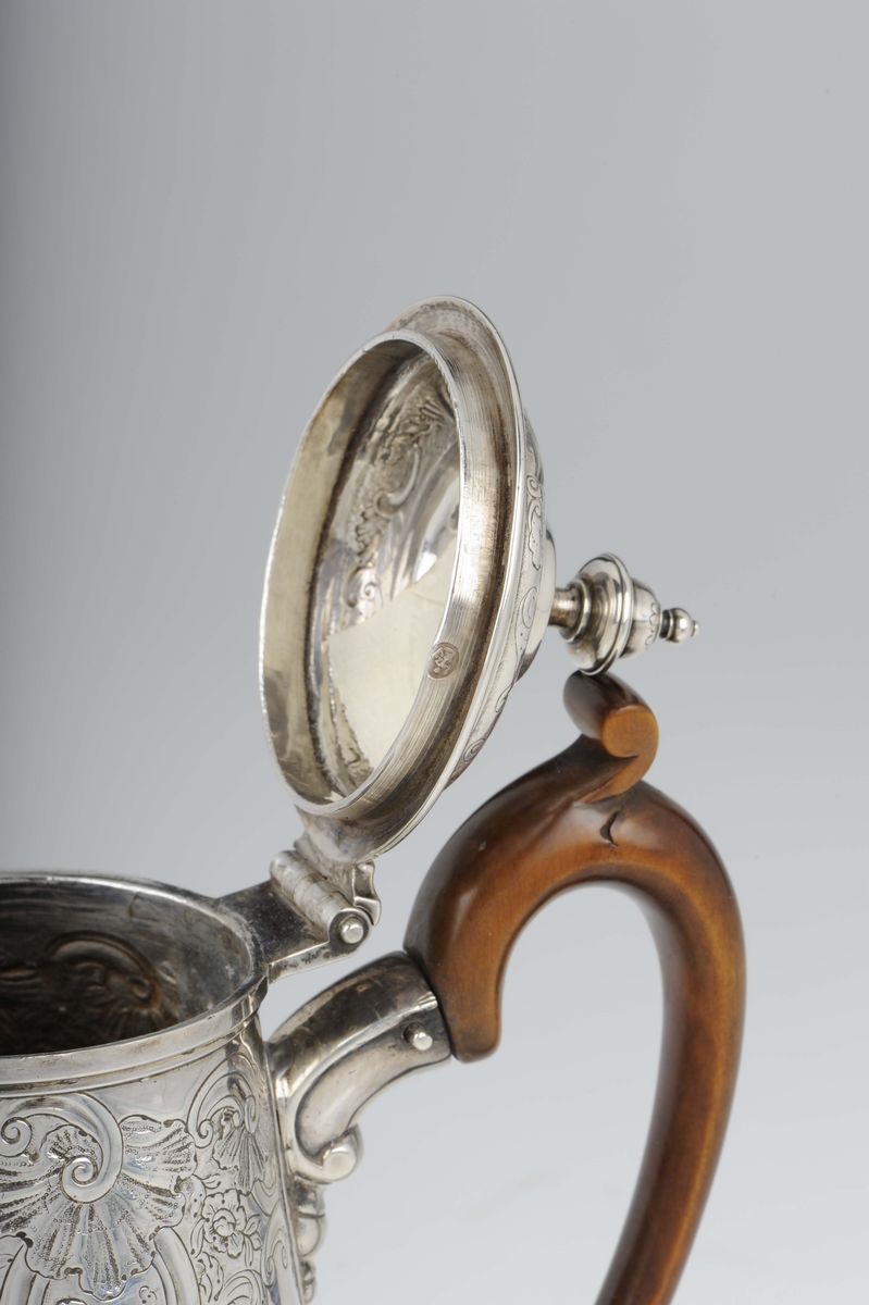 corpo troncoconico cesellato con motivi a volute e incisione sulla fascia con stemma, manico in legno sagomato, gr. 840, altezza cm 24,5
