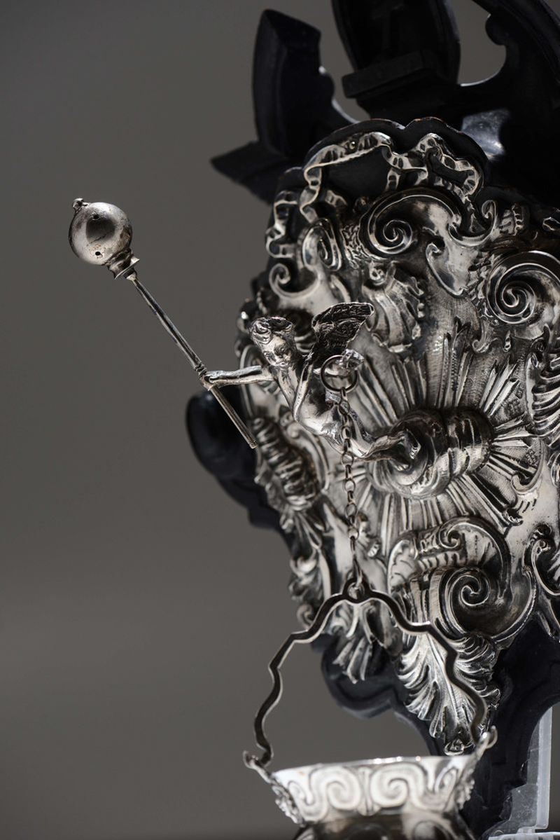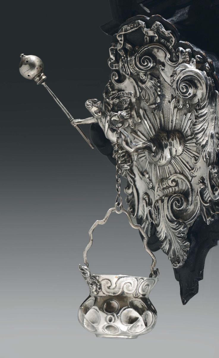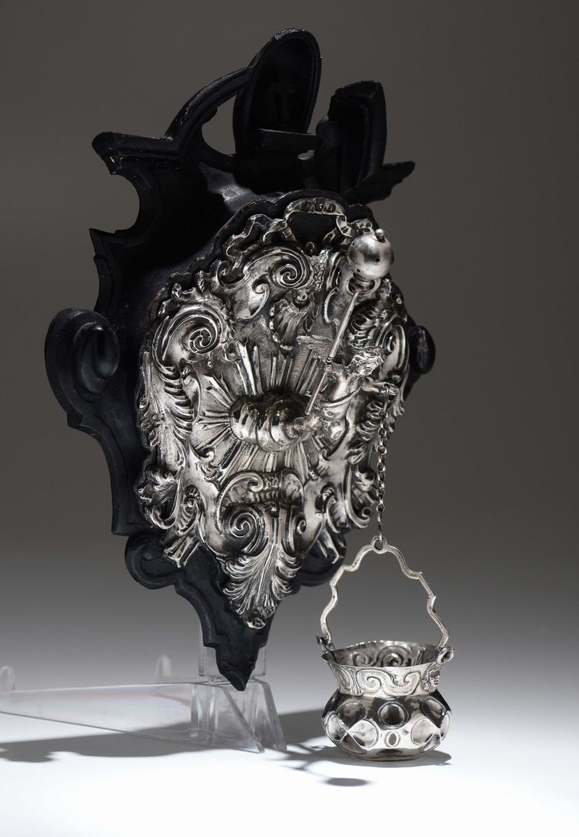 L’acquasantiera, realizzata per un uso privato e domestico, poggia su un supporto a sagoma architettonica in legno ebanizzato. Al centro della ricca composizione sbalzata con motivi fogliacei e a volute nel gusto del barocco settecentesco, fuoriesce aggettante da una nuvola la figura di un putto che con le mani impugna un aspersorio e sorregge il secchiello dell’acqua santa trattenuto da una catenella. Questo effetto vivamente dinamico è caratteristico della produzione napoletana di suppellettili sacre e nel nostro caso trova raffronti in analoghi esemplari in raccolte pubbliche e private documentati in “Argenti napoletani dal XVI al XIX secolo” di E. e C. Catello, Napoli 1973, tav. LXI pag. 318 e in “tre secoli di argenti napoletani”, catalogo mostra a cura di Corrado Catello NApoli, 1988, tav.40, pag. 114.Altezza cm 35