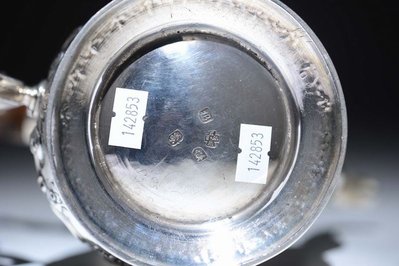 Caffettiera in argento fuso, sbalzato e cesellato. Londra 1757-1758. Argentieri William Shaw & William Priest