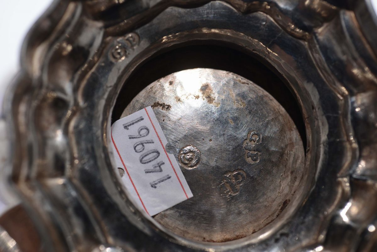 Caffettiera in argento sbalzato con manco in legno intagliato, punzoni di garanzia della zecca di Venezia e del saggiatore, [..]