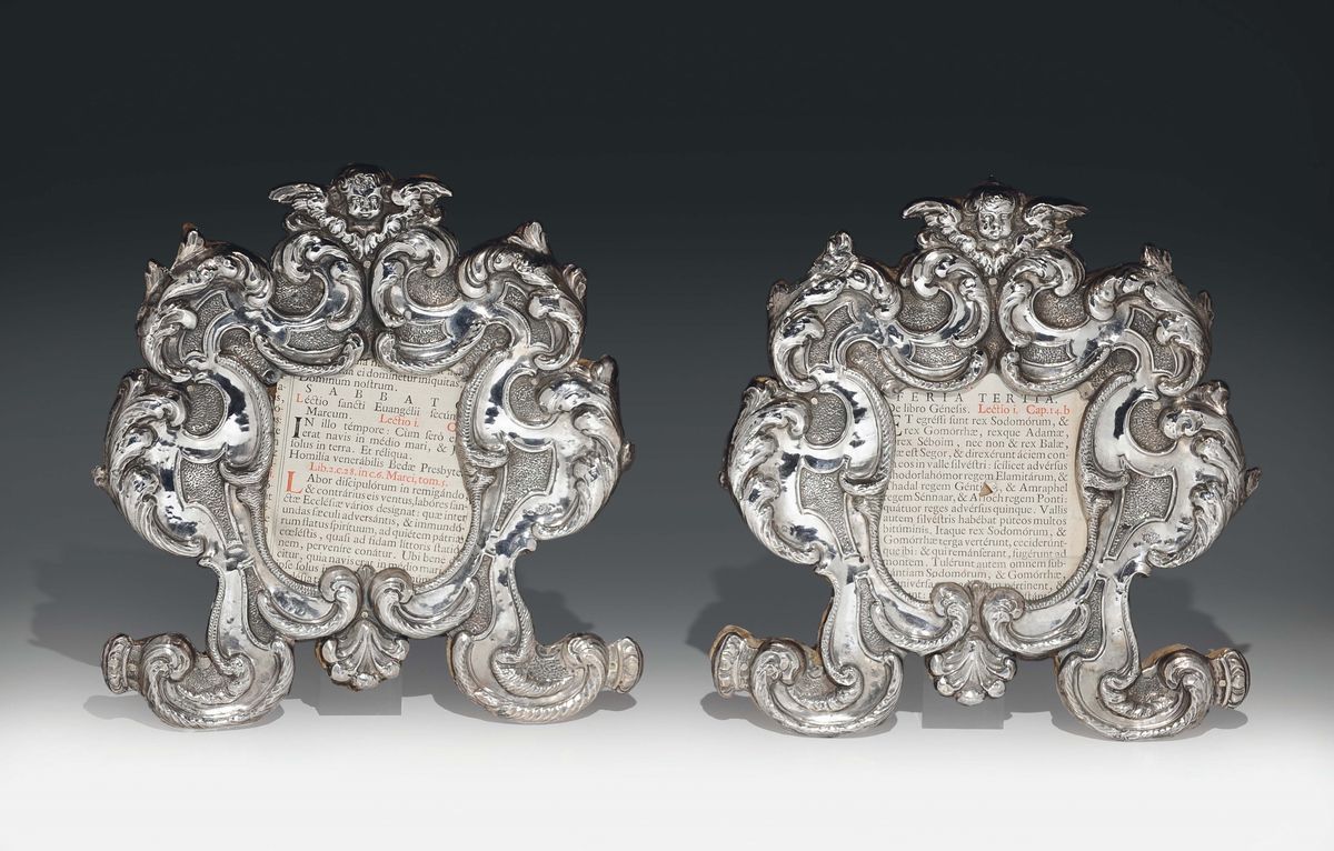 Elaborata decorazione barocca con volute, riserve e cascate floreali. Parte superiore ed inferiore con teste di cherubini alate.cm 48,5x40 e cm 26,5x28,5