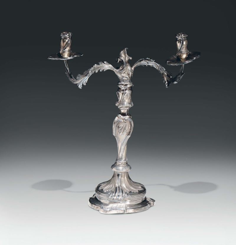 Corpo in argento fuso e cesellato con motivi a nervature e volute che partendo dal piede si innalzano verticalmente sul fusto con un movimento a torchon. Piede gradinato con alta base sagomata e fascia a nervature longitudinali. Parte superiore con braccia sagomate e decorata da motivi fogliacei raccordate da un elegante nodo a volute e pellacce rilievate.Importante esempio per qualità ed eleganza dalla produzione di gusto barocchetto dell’argenteria genovese. I doppieri sono probabilmente composti da una parte inferiore eseguita attorno al terzo quarto del XVIII secolo dal maestro argentiere Niccolò de Camilli che come correttamente asserisce Lodovico Caumont Caimi “...il marchio dovrebbe essere quello dell’argentiere Niccolò de Camilli che risulta essere stato console negli anni 1760 e il 1765 (vedi Broggero.Simonetti pag.469). Ora nessun marchio suo è documentato, ma a Genova in quell’epoca i marchi degli argentieri sono sempre con le iniziali, quindi quello del de Camilli doveva essere proprio NDC. Doveva essere un argentiere importante se è stato console due volte ed il periodo coincide perfettamente stilisticamente. Gli argenti genovesi con il marchio dell’argentiere senza la torretta sono rari ma esistono.” Quindi la parte superiore delle braccia, punzonata con la Torretta per l’anno 1793, dovrebbe essere un completamento antico ma posteriore di circa 30 anni, eseguite in fusione apposita, che in pieno periodo neoclassico, riprendesse in modo eccellente i modi del barocchetto in cui è realizzata la parte sottostante a testimonianza dell’importanza in cui è realizzata la parte sottostante a testimonianza dell’importanza in cui era tenuta in considerazione l’opera del de Camilli. Altezza cm 38, gr. 2200 circaSi ringrazia Lodovico Caumont Caimi per i preziosi suggerimenti.