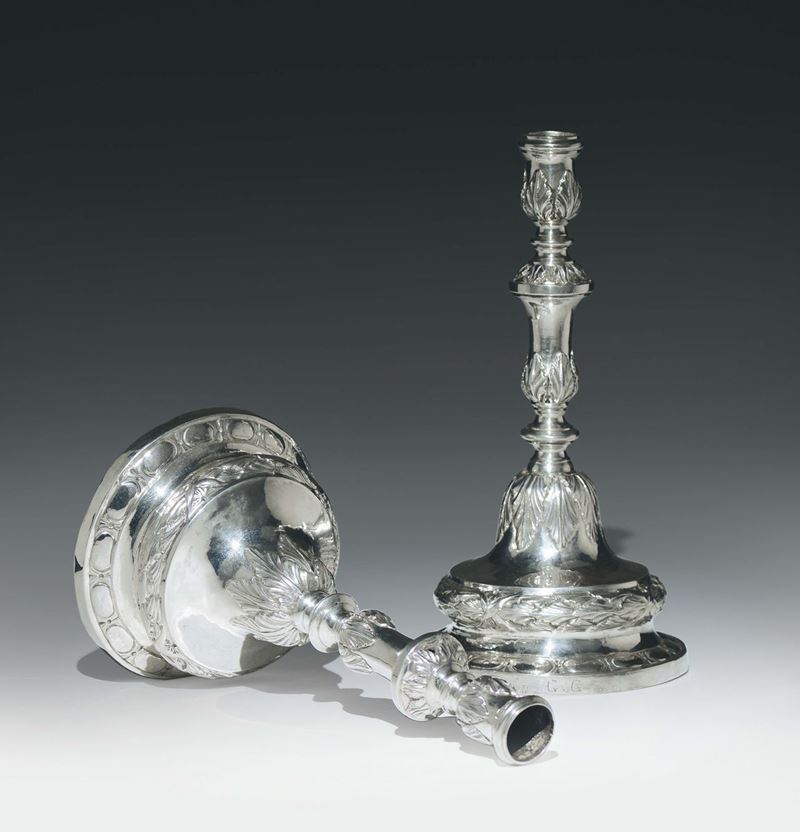 Coppia di candelieri in argento sbalzato e cesellato. Genova, punzone della Torretta per l’anno 1790