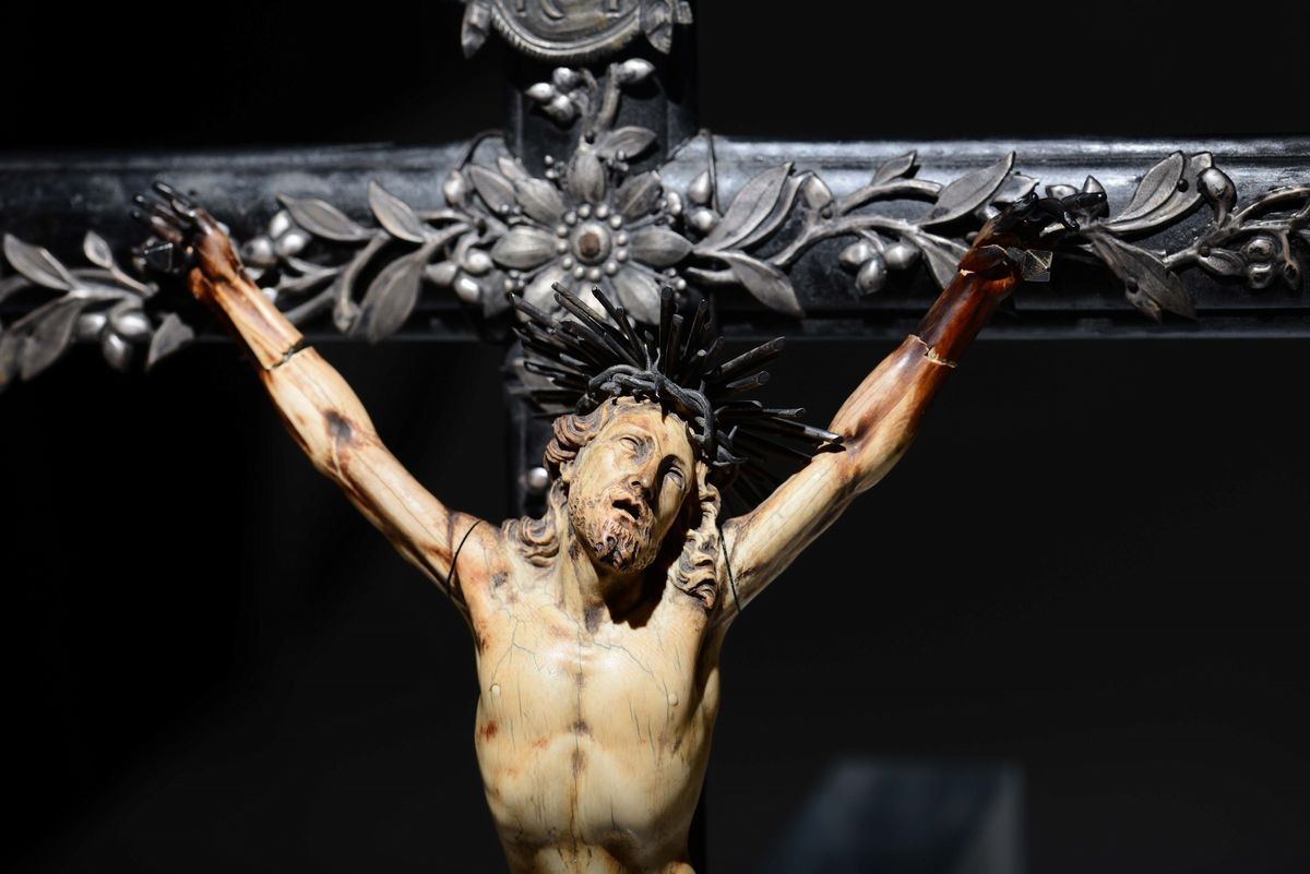 Crocefisso in legno ebanizzato con finimenti in argento sbalzato e figura di Cristo scolpito in avorio. Manifattura genovese del XVIII secolo