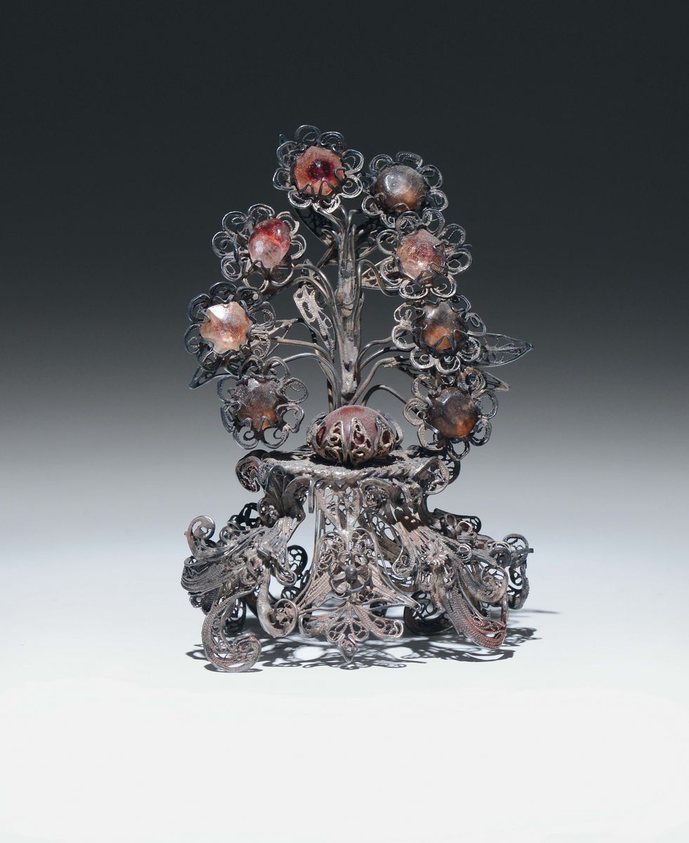 Piccola composizione floreale in filigrana, ambra e vetri colorati. Italia Sicilia XVIII secolo