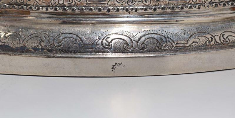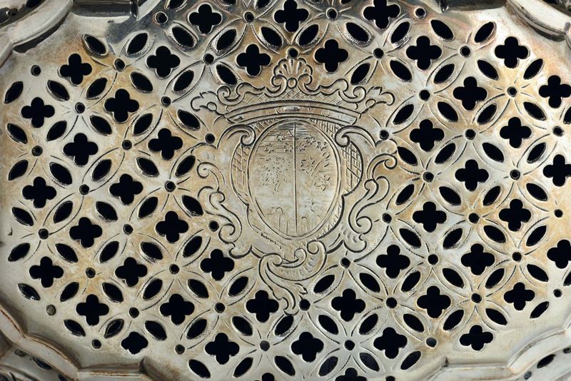 Lo scaldino, dalla forma poligonale e dalle misure contenute, è finemente cesellato con motivi a volute e riserve derivati dai modelli ornamentali introdotti in Francia dall’architetto Jean Bérain (1637-1711) che ebbero lago successo in tutta Europa. Particolarmente attenta nella ricezione di nuovi modelli stilistici provenienti d’oltralpe è a Milano la storica bottega del carciofo, già documentata dal 1587, come testimonia la comparazione con il piatto ovale, in collezione privata milanese, pubblicato a pag. 96 su “gli argenti milansesi” di G.Sambonet, Milano 1987, che presenta un medesimo modulo decorativo che comprende anche il piccolo paesaggio con architetture al centro di una riserva sagomata. Cm 19x12x18, gr.1060 circa.
