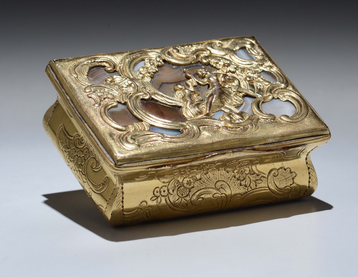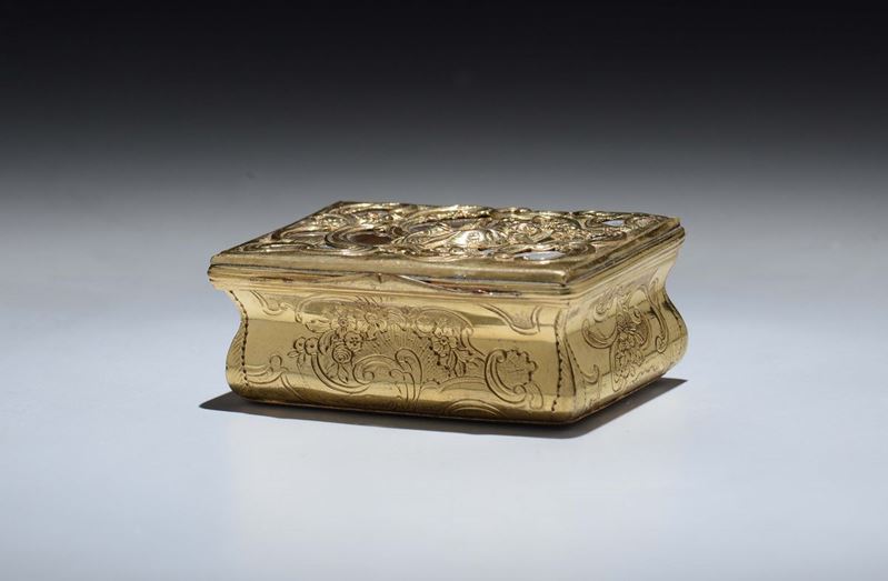 Tabacchiera in rame dorato decorato con motivi a volute. Europa fine XVIII secolo