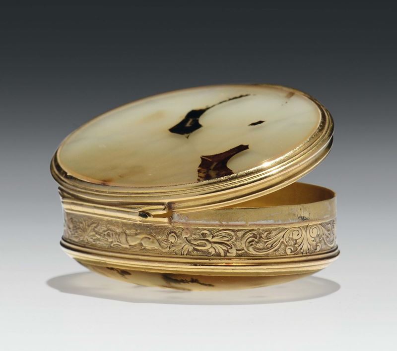 Tabacchiera ovale in agata con muratura in oro cesellato. Italia fine XVIII secolo