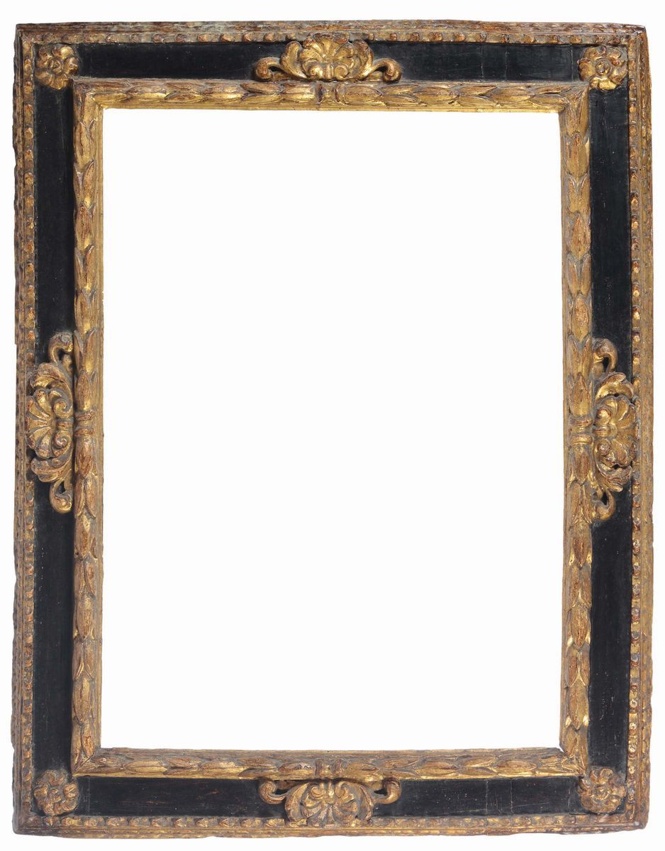 Coppia di cornici in legno ebanizzato e dorato, Spagna XVII secolo