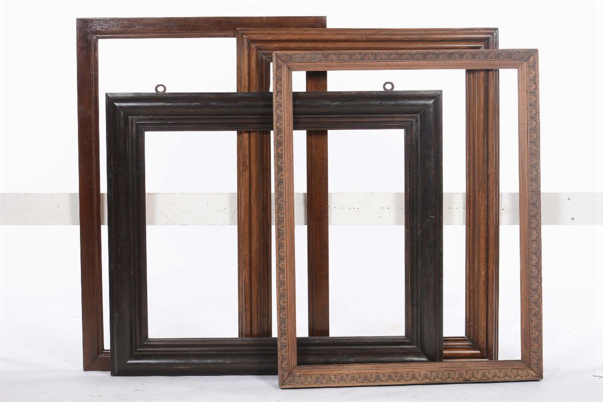 Tre cornici in legno di cui una scolpita a palmette e due a sagoma mossa, XIX-XX secolo