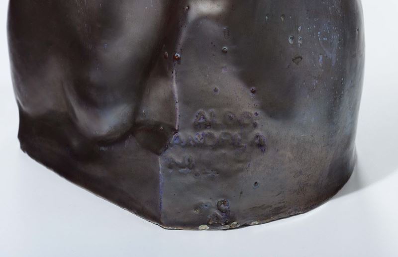 Terracotta maiolicata modellata a colaggio smaltata a lustri bronzei. Firma dell’artista e marchio della manifattura incussi. Altezza cm 57. 1935 circa