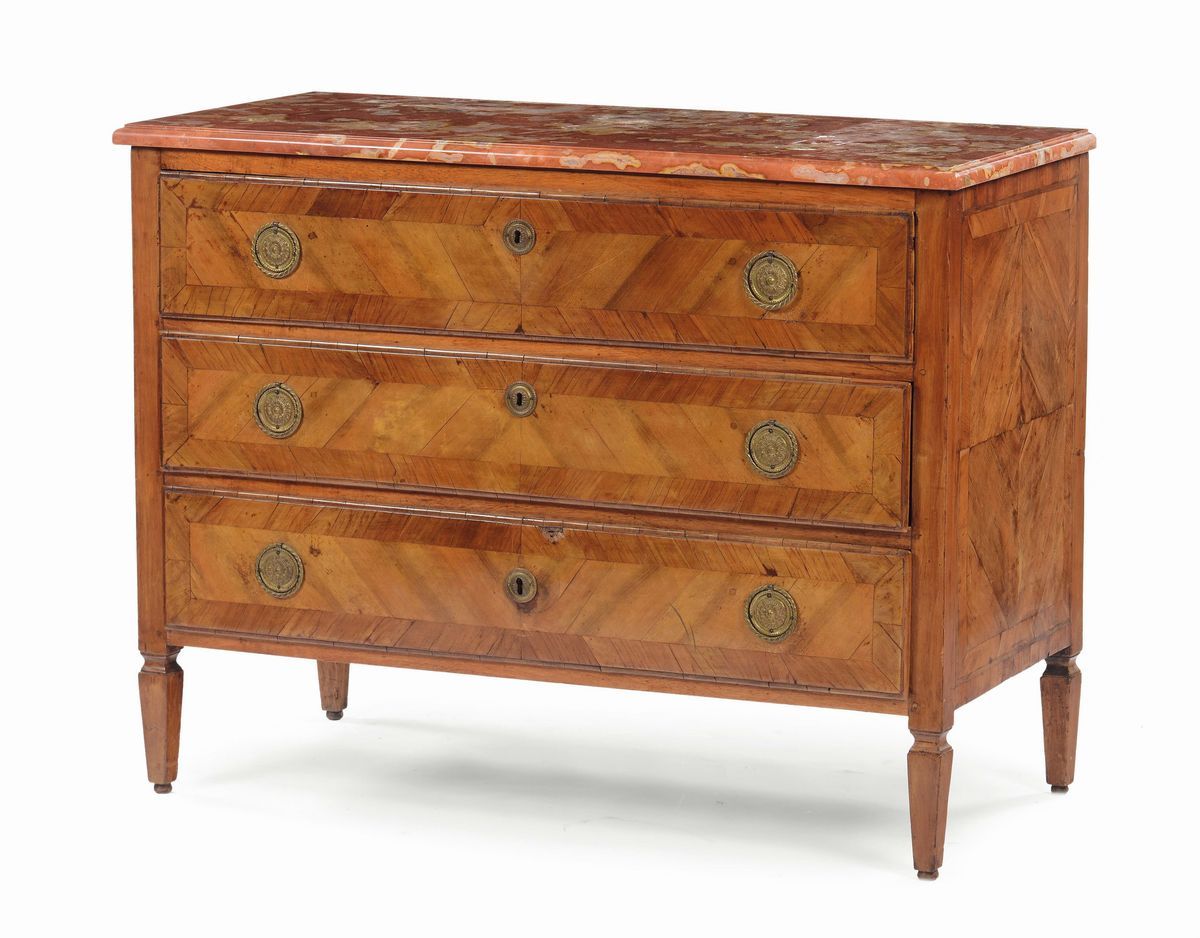 Comò a tre cassetti lastronato, fine XVIII secolo